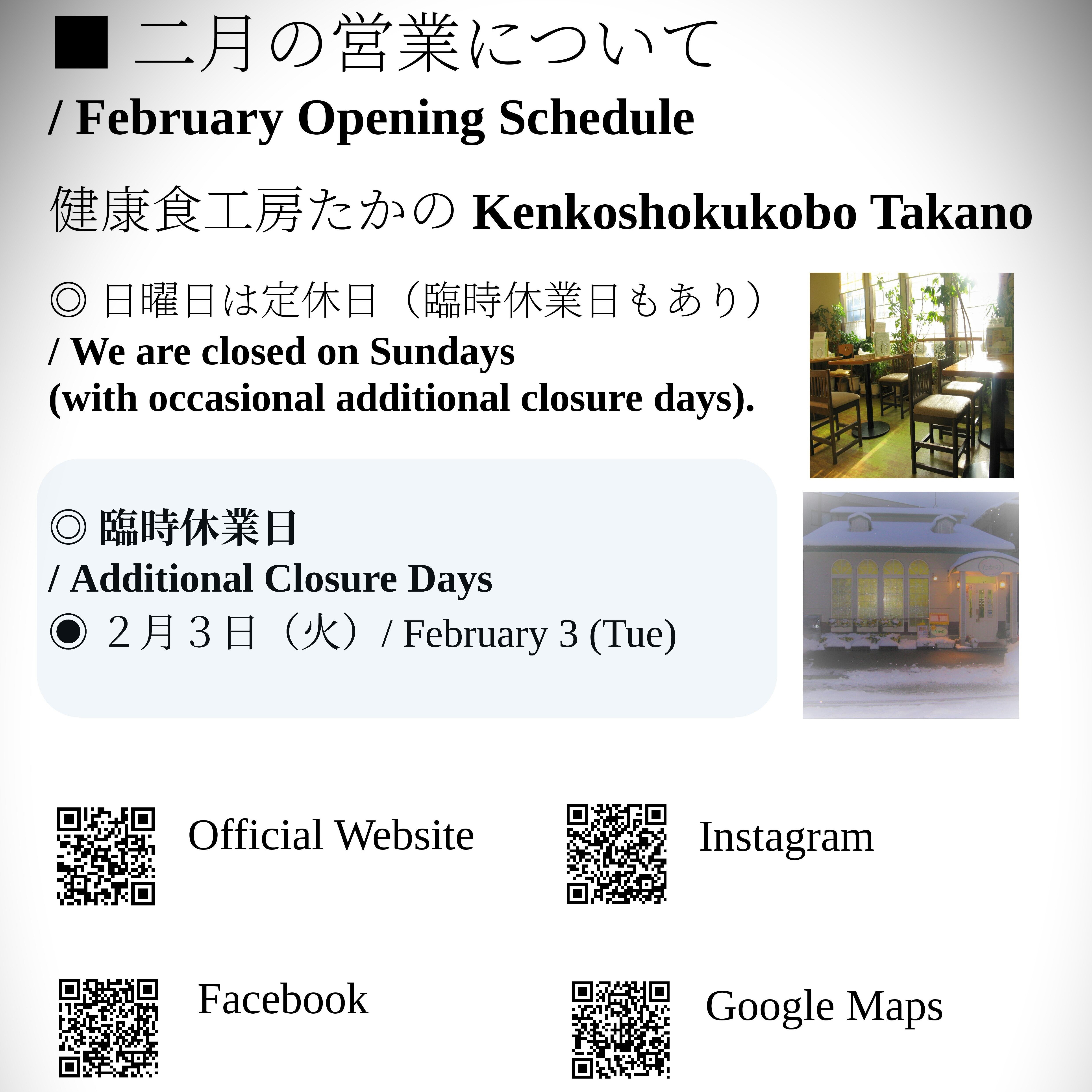 In the quiet winter of Kanazawa, we continue to serve food with care and sincerity. Please check the images for our February schedule.